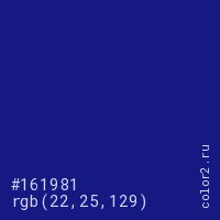 Цвет #161981 в цветовой модели RGB обозначается тремя октетами (22, 25, 129) в десятичном формате и #161981 в шестнадцатиричном (hex) формате, которые являются интенсивностью красного 22 (hex 16), интенсивность зелёного 25 (hex 19) и интенсивность синего 129 (hex 81).