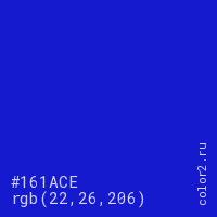 Цвет #161ACE в цветовой модели RGB обозначается тремя октетами (22, 26, 206) в десятичном формате и #161ACE в шестнадцатиричном (hex) формате, которые являются интенсивностью красного 22 (hex 16), интенсивность зелёного 26 (hex 1A) и интенсивность синего 206 (hex CE).
