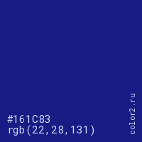 Цвет #161C83 в цветовой модели RGB обозначается тремя октетами (22, 28, 131) в десятичном формате и #161C83 в шестнадцатиричном (hex) формате, которые являются интенсивностью красного 22 (hex 16), интенсивность зелёного 28 (hex 1C) и интенсивность синего 131 (hex 83).