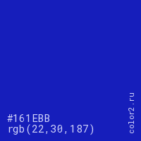 Цвет #161EBB в цветовой модели RGB обозначается тремя октетами (22, 30, 187) в десятичном формате и #161EBB в шестнадцатиричном (hex) формате, которые являются интенсивностью красного 22 (hex 16), интенсивность зелёного 30 (hex 1E) и интенсивность синего 187 (hex BB).