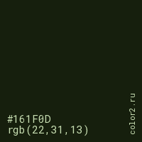 Цвет #161F0D в цветовой модели RGB обозначается тремя октетами (22, 31, 13) в десятичном формате и #161F0D в шестнадцатиричном (hex) формате, которые являются интенсивностью красного 22 (hex 16), интенсивность зелёного 31 (hex 1F) и интенсивность синего 13 (hex 0D).