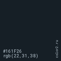 Цвет #161F26 в цветовой модели RGB обозначается тремя октетами (22, 31, 38) в десятичном формате и #161F26 в шестнадцатиричном (hex) формате, которые являются интенсивностью красного 22 (hex 16), интенсивность зелёного 31 (hex 1F) и интенсивность синего 38 (hex 26).