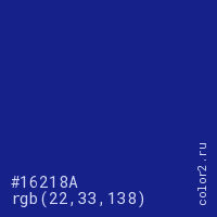 Цвет #16218A в цветовой модели RGB обозначается тремя октетами (22, 33, 138) в десятичном формате и #16218A в шестнадцатиричном (hex) формате, которые являются интенсивностью красного 22 (hex 16), интенсивность зелёного 33 (hex 21) и интенсивность синего 138 (hex 8A).