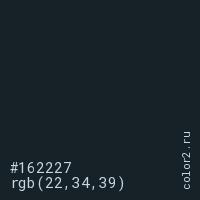 Цвет #162227 в цветовой модели RGB обозначается тремя октетами (22, 34, 39) в десятичном формате и #162227 в шестнадцатиричном (hex) формате, которые являются интенсивностью красного 22 (hex 16), интенсивность зелёного 34 (hex 22) и интенсивность синего 39 (hex 27).