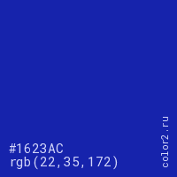 Цвет #1623AC в цветовой модели RGB обозначается тремя октетами (22, 35, 172) в десятичном формате и #1623AC в шестнадцатиричном (hex) формате, которые являются интенсивностью красного 22 (hex 16), интенсивность зелёного 35 (hex 23) и интенсивность синего 172 (hex AC).