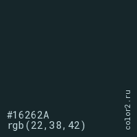 Цвет #16262A в цветовой модели RGB обозначается тремя октетами (22, 38, 42) в десятичном формате и #16262A в шестнадцатиричном (hex) формате, которые являются интенсивностью красного 22 (hex 16), интенсивность зелёного 38 (hex 26) и интенсивность синего 42 (hex 2A).