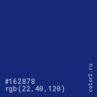 Цвет #162878 в цветовой модели RGB обозначается тремя октетами (22, 40, 120) в десятичном формате и #162878 в шестнадцатиричном (hex) формате, которые являются интенсивностью красного 22 (hex 16), интенсивность зелёного 40 (hex 28) и интенсивность синего 120 (hex 78).
