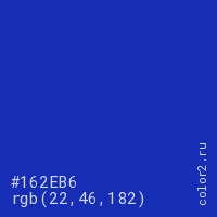 Цвет #162EB6 в цветовой модели RGB обозначается тремя октетами (22, 46, 182) в десятичном формате и #162EB6 в шестнадцатиричном (hex) формате, которые являются интенсивностью красного 22 (hex 16), интенсивность зелёного 46 (hex 2E) и интенсивность синего 182 (hex B6).