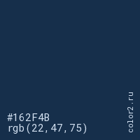 Цвет #162F4B в цветовой модели RGB обозначается тремя октетами (22, 47, 75) в десятичном формате и #162F4B в шестнадцатиричном (hex) формате, которые являются интенсивностью красного 22 (hex 16), интенсивность зелёного 47 (hex 2F) и интенсивность синего 75 (hex 4B).