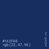 Цвет #162F60 в цветовой модели RGB обозначается тремя октетами (22, 47, 96) в десятичном формате и #162F60 в шестнадцатиричном (hex) формате, которые являются интенсивностью красного 22 (hex 16), интенсивность зелёного 47 (hex 2F) и интенсивность синего 96 (hex 60).