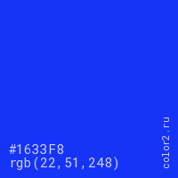 Цвет #1633F8 в цветовой модели RGB обозначается тремя октетами (22, 51, 248) в десятичном формате и #1633F8 в шестнадцатиричном (hex) формате, которые являются интенсивностью красного 22 (hex 16), интенсивность зелёного 51 (hex 33) и интенсивность синего 248 (hex F8).