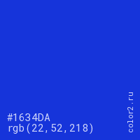 Цвет #1634DA в цветовой модели RGB обозначается тремя октетами (22, 52, 218) в десятичном формате и #1634DA в шестнадцатиричном (hex) формате, которые являются интенсивностью красного 22 (hex 16), интенсивность зелёного 52 (hex 34) и интенсивность синего 218 (hex DA).