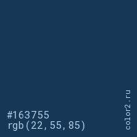 Цвет #163755 в цветовой модели RGB обозначается тремя октетами (22, 55, 85) в десятичном формате и #163755 в шестнадцатиричном (hex) формате, которые являются интенсивностью красного 22 (hex 16), интенсивность зелёного 55 (hex 37) и интенсивность синего 85 (hex 55).