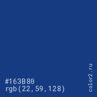 Цвет #163B80 в цветовой модели RGB обозначается тремя октетами (22, 59, 128) в десятичном формате и #163B80 в шестнадцатиричном (hex) формате, которые являются интенсивностью красного 22 (hex 16), интенсивность зелёного 59 (hex 3B) и интенсивность синего 128 (hex 80).
