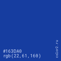 Цвет #163DA0 в цветовой модели RGB обозначается тремя октетами (22, 61, 160) в десятичном формате и #163DA0 в шестнадцатиричном (hex) формате, которые являются интенсивностью красного 22 (hex 16), интенсивность зелёного 61 (hex 3D) и интенсивность синего 160 (hex A0).