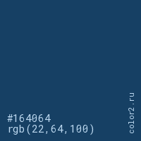 Цвет #164064 в цветовой модели RGB обозначается тремя октетами (22, 64, 100) в десятичном формате и #164064 в шестнадцатиричном (hex) формате, которые являются интенсивностью красного 22 (hex 16), интенсивность зелёного 64 (hex 40) и интенсивность синего 100 (hex 64).