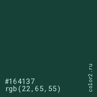 Цвет #164137 в цветовой модели RGB обозначается тремя октетами (22, 65, 55) в десятичном формате и #164137 в шестнадцатиричном (hex) формате, которые являются интенсивностью красного 22 (hex 16), интенсивность зелёного 65 (hex 41) и интенсивность синего 55 (hex 37).