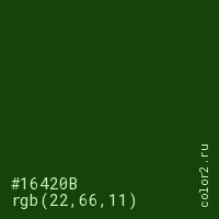 Цвет #16420B в цветовой модели RGB обозначается тремя октетами (22, 66, 11) в десятичном формате и #16420B в шестнадцатиричном (hex) формате, которые являются интенсивностью красного 22 (hex 16), интенсивность зелёного 66 (hex 42) и интенсивность синего 11 (hex 0B).
