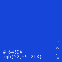 Цвет #1645DA в цветовой модели RGB обозначается тремя октетами (22, 69, 218) в десятичном формате и #1645DA в шестнадцатиричном (hex) формате, которые являются интенсивностью красного 22 (hex 16), интенсивность зелёного 69 (hex 45) и интенсивность синего 218 (hex DA).