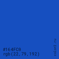 Цвет #164FC0 в цветовой модели RGB обозначается тремя октетами (22, 79, 192) в десятичном формате и #164FC0 в шестнадцатиричном (hex) формате, которые являются интенсивностью красного 22 (hex 16), интенсивность зелёного 79 (hex 4F) и интенсивность синего 192 (hex C0).