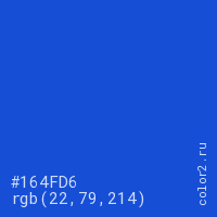 Цвет #164FD6 в цветовой модели RGB обозначается тремя октетами (22, 79, 214) в десятичном формате и #164FD6 в шестнадцатиричном (hex) формате, которые являются интенсивностью красного 22 (hex 16), интенсивность зелёного 79 (hex 4F) и интенсивность синего 214 (hex D6).