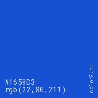 Цвет #1650D3 в цветовой модели RGB обозначается тремя октетами (22, 80, 211) в десятичном формате и #1650D3 в шестнадцатиричном (hex) формате, которые являются интенсивностью красного 22 (hex 16), интенсивность зелёного 80 (hex 50) и интенсивность синего 211 (hex D3).