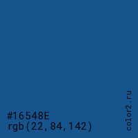 Цвет #16548E в цветовой модели RGB обозначается тремя октетами (22, 84, 142) в десятичном формате и #16548E в шестнадцатиричном (hex) формате, которые являются интенсивностью красного 22 (hex 16), интенсивность зелёного 84 (hex 54) и интенсивность синего 142 (hex 8E).