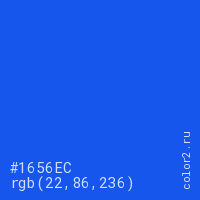 Цвет #1656EC в цветовой модели RGB обозначается тремя октетами (22, 86, 236) в десятичном формате и #1656EC в шестнадцатиричном (hex) формате, которые являются интенсивностью красного 22 (hex 16), интенсивность зелёного 86 (hex 56) и интенсивность синего 236 (hex EC).