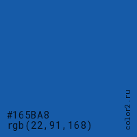 Цвет #165BA8 в цветовой модели RGB обозначается тремя октетами (22, 91, 168) в десятичном формате и #165BA8 в шестнадцатиричном (hex) формате, которые являются интенсивностью красного 22 (hex 16), интенсивность зелёного 91 (hex 5B) и интенсивность синего 168 (hex A8).