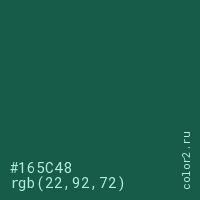 Цвет #165C48 в цветовой модели RGB обозначается тремя октетами (22, 92, 72) в десятичном формате и #165C48 в шестнадцатиричном (hex) формате, которые являются интенсивностью красного 22 (hex 16), интенсивность зелёного 92 (hex 5C) и интенсивность синего 72 (hex 48).