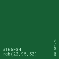 Цвет #165F34 в цветовой модели RGB обозначается тремя октетами (22, 95, 52) в десятичном формате и #165F34 в шестнадцатиричном (hex) формате, которые являются интенсивностью красного 22 (hex 16), интенсивность зелёного 95 (hex 5F) и интенсивность синего 52 (hex 34).