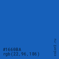 Цвет #1660BA в цветовой модели RGB обозначается тремя октетами (22, 96, 186) в десятичном формате и #1660BA в шестнадцатиричном (hex) формате, которые являются интенсивностью красного 22 (hex 16), интенсивность зелёного 96 (hex 60) и интенсивность синего 186 (hex BA).