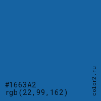 Цвет #1663A2 в цветовой модели RGB обозначается тремя октетами (22, 99, 162) в десятичном формате и #1663A2 в шестнадцатиричном (hex) формате, которые являются интенсивностью красного 22 (hex 16), интенсивность зелёного 99 (hex 63) и интенсивность синего 162 (hex A2).