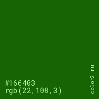 Цвет #166403 в цветовой модели RGB обозначается тремя октетами (22, 100, 3) в десятичном формате и #166403 в шестнадцатиричном (hex) формате, которые являются интенсивностью красного 22 (hex 16), интенсивность зелёного 100 (hex 64) и интенсивность синего 3 (hex 03).