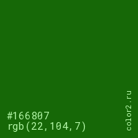 Цвет #166807 в цветовой модели RGB обозначается тремя октетами (22, 104, 7) в десятичном формате и #166807 в шестнадцатиричном (hex) формате, которые являются интенсивностью красного 22 (hex 16), интенсивность зелёного 104 (hex 68) и интенсивность синего 7 (hex 07).
