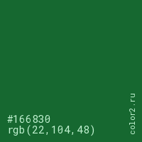 Цвет #166830 в цветовой модели RGB обозначается тремя октетами (22, 104, 48) в десятичном формате и #166830 в шестнадцатиричном (hex) формате, которые являются интенсивностью красного 22 (hex 16), интенсивность зелёного 104 (hex 68) и интенсивность синего 48 (hex 30).