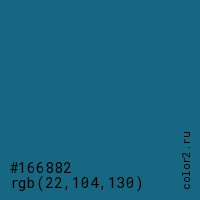 Цвет #166882 в цветовой модели RGB обозначается тремя октетами (22, 104, 130) в десятичном формате и #166882 в шестнадцатиричном (hex) формате, которые являются интенсивностью красного 22 (hex 16), интенсивность зелёного 104 (hex 68) и интенсивность синего 130 (hex 82).