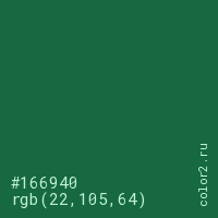 Цвет #166940 в цветовой модели RGB обозначается тремя октетами (22, 105, 64) в десятичном формате и #166940 в шестнадцатиричном (hex) формате, которые являются интенсивностью красного 22 (hex 16), интенсивность зелёного 105 (hex 69) и интенсивность синего 64 (hex 40).