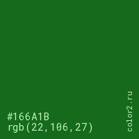 Цвет #166A1B в цветовой модели RGB обозначается тремя октетами (22, 106, 27) в десятичном формате и #166A1B в шестнадцатиричном (hex) формате, которые являются интенсивностью красного 22 (hex 16), интенсивность зелёного 106 (hex 6A) и интенсивность синего 27 (hex 1B).