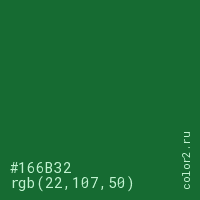 Цвет #166B32 в цветовой модели RGB обозначается тремя октетами (22, 107, 50) в десятичном формате и #166B32 в шестнадцатиричном (hex) формате, которые являются интенсивностью красного 22 (hex 16), интенсивность зелёного 107 (hex 6B) и интенсивность синего 50 (hex 32).
