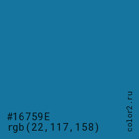 Цвет #16759E в цветовой модели RGB обозначается тремя октетами (22, 117, 158) в десятичном формате и #16759E в шестнадцатиричном (hex) формате, которые являются интенсивностью красного 22 (hex 16), интенсивность зелёного 117 (hex 75) и интенсивность синего 158 (hex 9E).