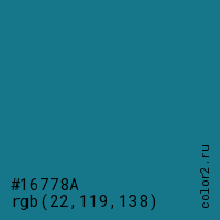 Цвет #16778A в цветовой модели RGB обозначается тремя октетами (22, 119, 138) в десятичном формате и #16778A в шестнадцатиричном (hex) формате, которые являются интенсивностью красного 22 (hex 16), интенсивность зелёного 119 (hex 77) и интенсивность синего 138 (hex 8A).