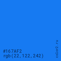 Цвет #167AF2 в цветовой модели RGB обозначается тремя октетами (22, 122, 242) в десятичном формате и #167AF2 в шестнадцатиричном (hex) формате, которые являются интенсивностью красного 22 (hex 16), интенсивность зелёного 122 (hex 7A) и интенсивность синего 242 (hex F2).