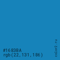 Цвет #1683BA в цветовой модели RGB обозначается тремя октетами (22, 131, 186) в десятичном формате и #1683BA в шестнадцатиричном (hex) формате, которые являются интенсивностью красного 22 (hex 16), интенсивность зелёного 131 (hex 83) и интенсивность синего 186 (hex BA).