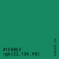 Цвет #168862 в цветовой модели RGB обозначается тремя октетами (22, 136, 98) в десятичном формате и #168862 в шестнадцатиричном (hex) формате, которые являются интенсивностью красного 22 (hex 16), интенсивность зелёного 136 (hex 88) и интенсивность синего 98 (hex 62).