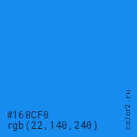 Цвет #168CF0 в цветовой модели RGB обозначается тремя октетами (22, 140, 240) в десятичном формате и #168CF0 в шестнадцатиричном (hex) формате, которые являются интенсивностью красного 22 (hex 16), интенсивность зелёного 140 (hex 8C) и интенсивность синего 240 (hex F0).