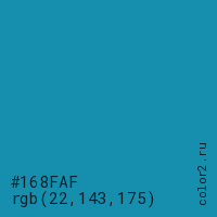 Цвет #168FAF в цветовой модели RGB обозначается тремя октетами (22, 143, 175) в десятичном формате и #168FAF в шестнадцатиричном (hex) формате, которые являются интенсивностью красного 22 (hex 16), интенсивность зелёного 143 (hex 8F) и интенсивность синего 175 (hex AF).