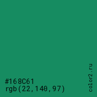 Цвет #168C61 в цветовой модели RGB обозначается тремя октетами (22, 140, 97) в десятичном формате и #168C61 в шестнадцатиричном (hex) формате, которые являются интенсивностью красного 22 (hex 16), интенсивность зелёного 140 (hex 8C) и интенсивность синего 97 (hex 61).