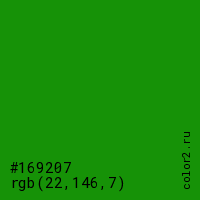 Цвет #169207 в цветовой модели RGB обозначается тремя октетами (22, 146, 7) в десятичном формате и #169207 в шестнадцатиричном (hex) формате, которые являются интенсивностью красного 22 (hex 16), интенсивность зелёного 146 (hex 92) и интенсивность синего 7 (hex 07).