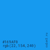 Цвет #169AF0 в цветовой модели RGB обозначается тремя октетами (22, 154, 240) в десятичном формате и #169AF0 в шестнадцатиричном (hex) формате, которые являются интенсивностью красного 22 (hex 16), интенсивность зелёного 154 (hex 9A) и интенсивность синего 240 (hex F0).